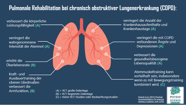 Das Ziel einer Lungenrehabilitation ist die Verbesserung der Übungskapazität, Leistungsfähigkeit und Belastbarkeit und dadurch auch der Lebensqualität, sowie das Reduzieren von Exazerbationen und Sterblichkeit. Hierfür wird eine Kombination aus Krafttraining, Intervalltraining und Ausdauertraining empfohlen. Mehrere Studien zeigen, dass eine Kombination dieser Trainingsmethoden einen großen Einfluss haben auf die Lebensqualität, Belastbarkeit, physische Leistung, Reduktion von Kurzatmigkeit, Reduktion von Krankenhausaufenthalten und Sterblichkeit sowie die Reduktion von Angst und Depressionen. 17, 18, 19, 20, 21