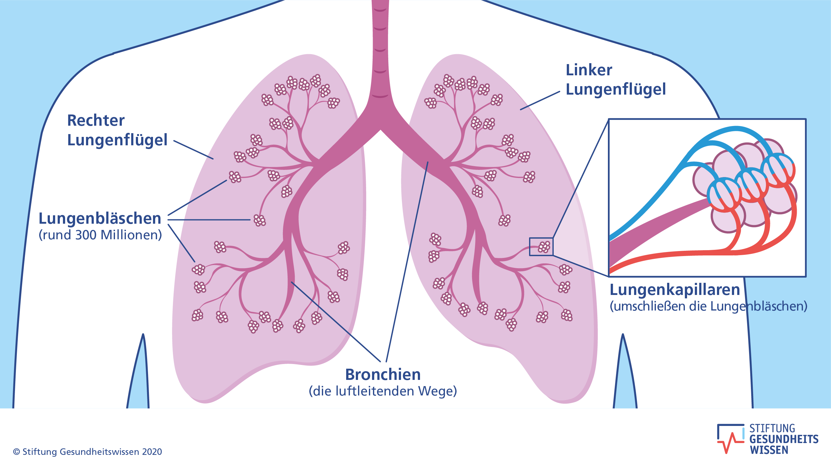 Die Lunge besteht aus einem rechten und linken Lungenflügel. Der rechte Lungenflügel wird als drei Lungenlappen gebildet und der linke Lungenflügel aus zwei Lungenlappen, damit das Herz noch genug Platz hat.