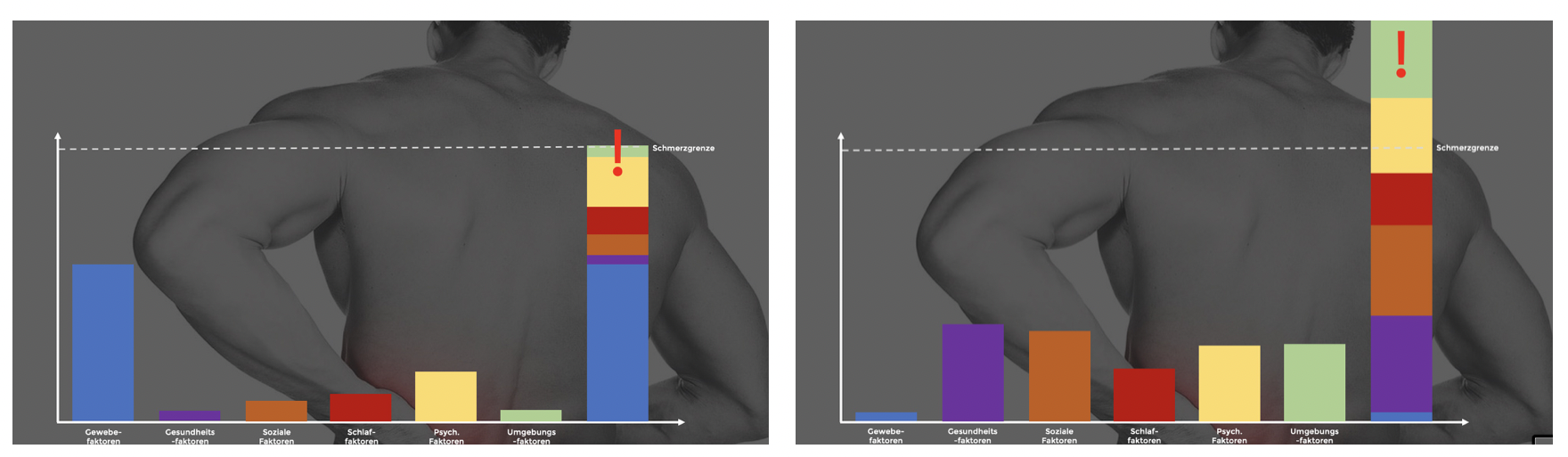 Je nach Individuum, Entstehungsweise, Lebensstil und Vorgeschichte können die oben genannten Risikofaktoren eine unterschiedliche Rolle spielen in der Entstehung und Instandhaltung von Rückenschmerzen. Siehe die hier unten aufgelisteten Bilder für eine visuelle Verdeutlichung hiervon.