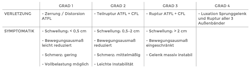 Um Bandverletzungen zu klassifizieren wird häufig die Einteilung der “Amarican Medical Association” herangezogen. In der unten stehenden Tabelle können sie die Grade der Distorsionen sehen und mit welchen Klinischen Zeichen diese einhergehen. 23