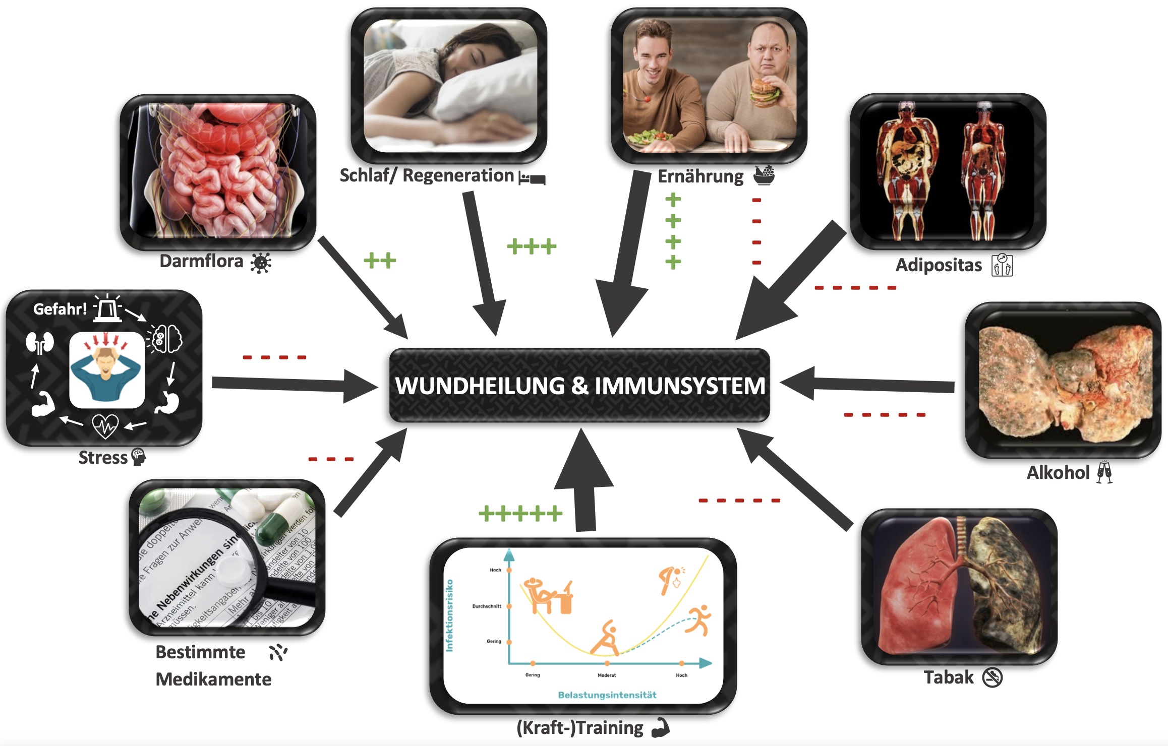 Durch die beim Restkörpertraining freigesetzten Myokine, profitiert nicht nur die lokal arbeitende Muskulatur, sondern auch der Wundheilungsprozess sowie Aufbauprozesse in der gesamten betroffenen Struktur werden positiv beeinflusst.